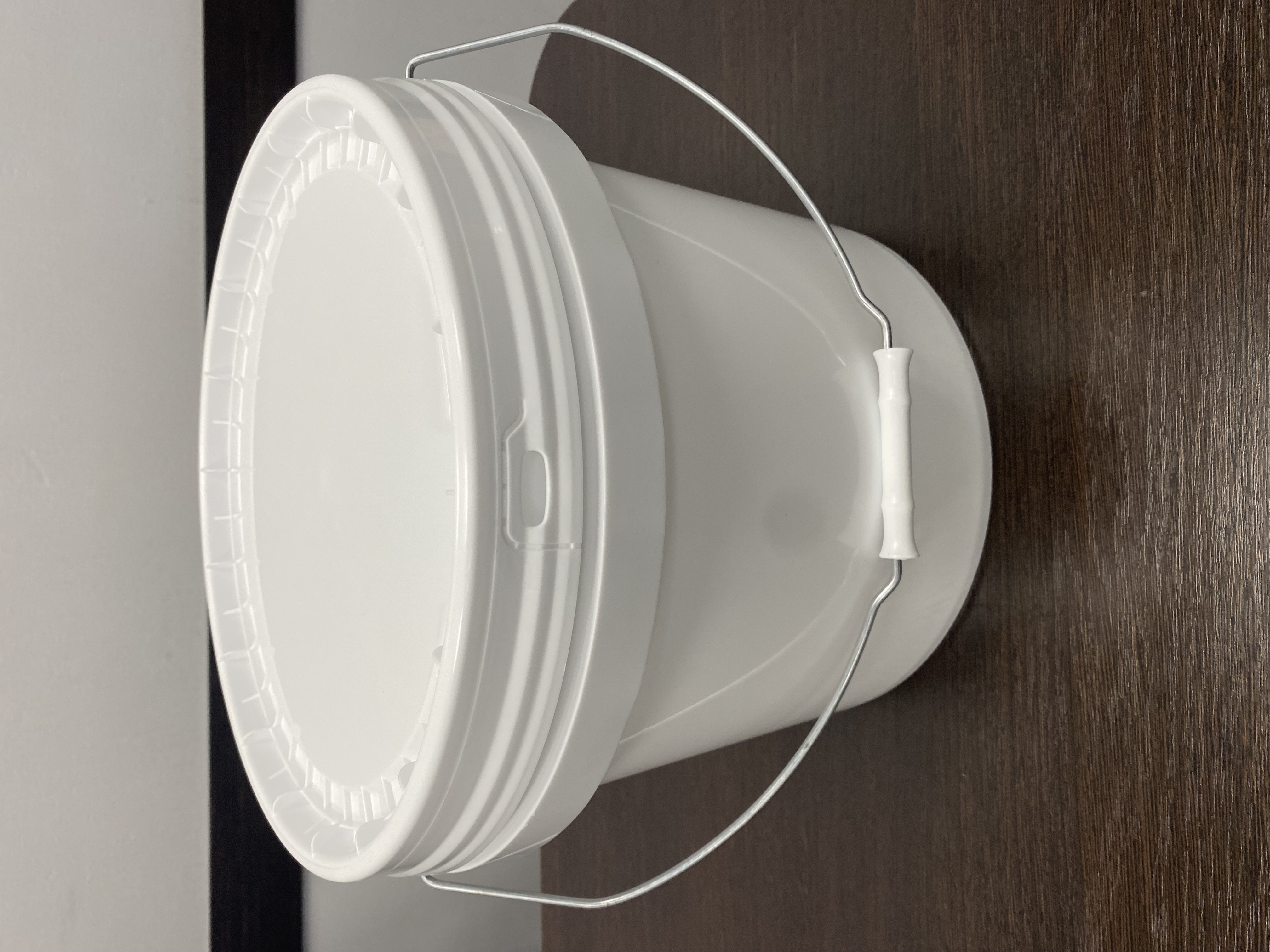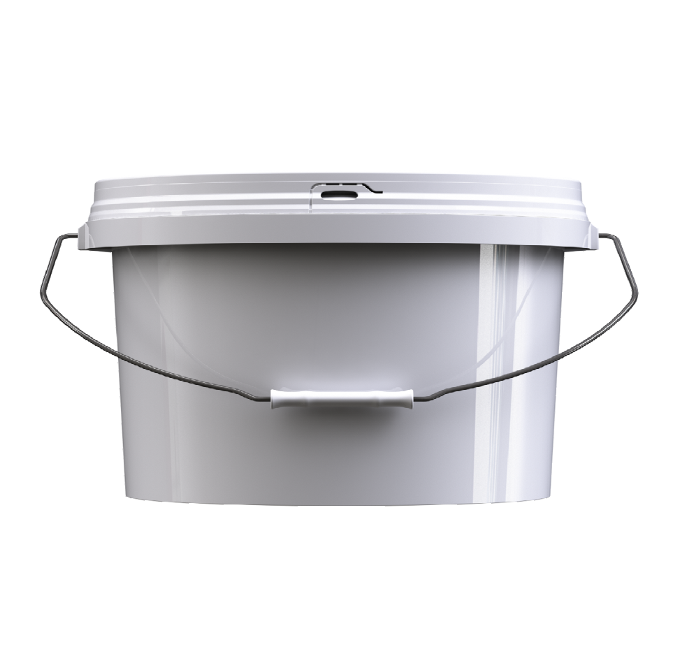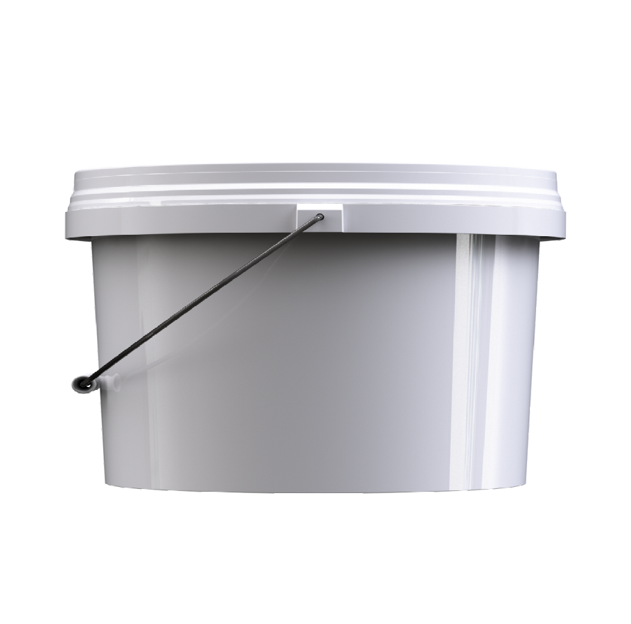 Пластиковое ведро JHPS 1350 белого цвета объемом 14,2 литра (или 3,5 галлона) с металлической ручкой (есть ролик) и пластмассовой крышкой LHPS 3100. Пластик - первичный, пищевой, без добавления материалов вторичной переработки.